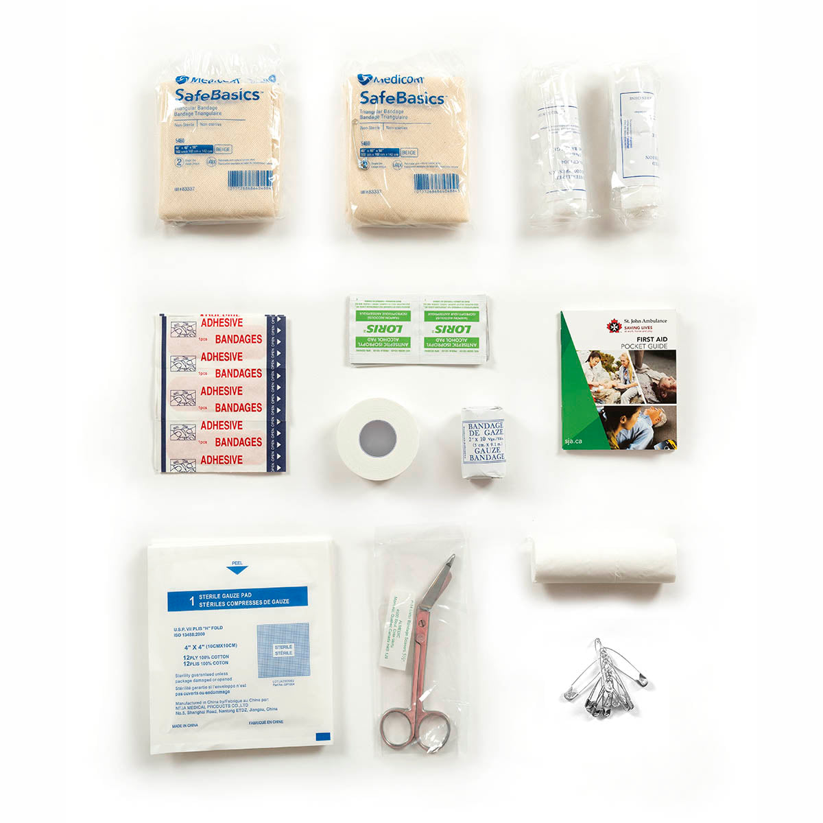 Quebec Regulation Section 5, First Aid Kit Contents:1 ADHESIVE TAPE 1″ x 5yds5 ALCOHOL PREP PADS2 COMPRESS BANDAGE 4″1 GAUZE BANDAGE 2″ x 10yds1 GAUZE BANDAGE 4″ x 5yds5 GAUZE PADS 4″ x 4″5 PLASTIC BANDAGES 1″ x 3″ 5 1 POCKET FIRST AID GUIDE1 SAFETY PINS (sets of 12)1 SCISSORS, LISTER BANDAGE2 TRIANGULAR BANDAGE